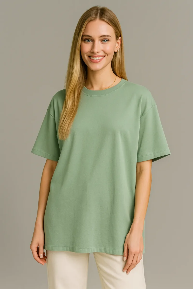 Upgrade your wardrobe with this Women’s Mint Green Oversized T-Shirt, made from soft, breathable cotton for a relaxed fit. Featuring a ribbed crewneck and double-stitched hems, this lightweight tee is perfect for streetwear, casual wear, or layering in any season.